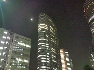 夜は歯医者。見上げれば品川港南口のビルの林に満月に少し足りない月が。