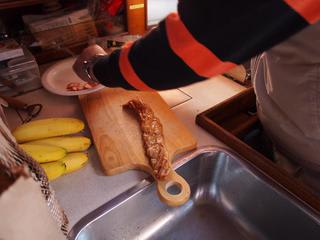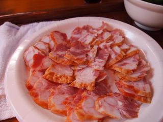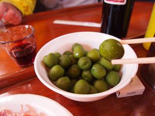 メニューは簡単なつまみ。シシリー産新オリーブ塩漬けと豚バラ軟骨の燻製。