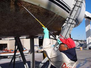 いままでよりも頑固な汚れの船底掃除も、これだけ人数がいれば、安心です。